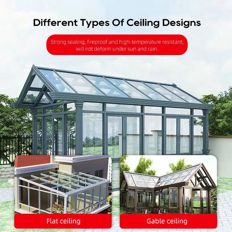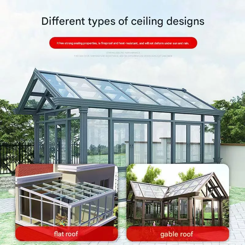 سن روم اپناتا ہے a تھرمل بریک ایلومینیم فریم + انسولیٹڈ ٹیمپرڈ گلاس ساخت۔ فریم کالم، شہتیر، اور اخترن سپورٹ پر مشتمل ہوتا ہے، جو ایک ماڈیولر سسٹم کے ذریعے جمع ہوتا ہے۔ چھت کے متعدد طرزوں کی حمایت کرتا ہے، بشمول گیبل چھتیں، فلیٹ چھتیں، اور خمیدہ چھتیں۔